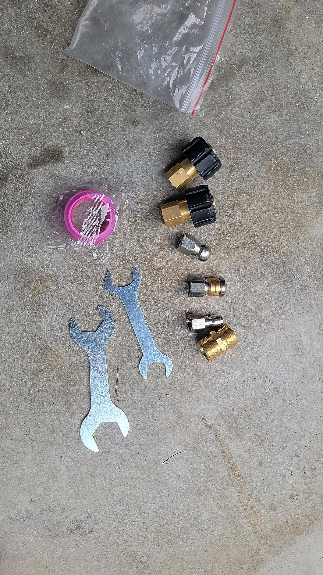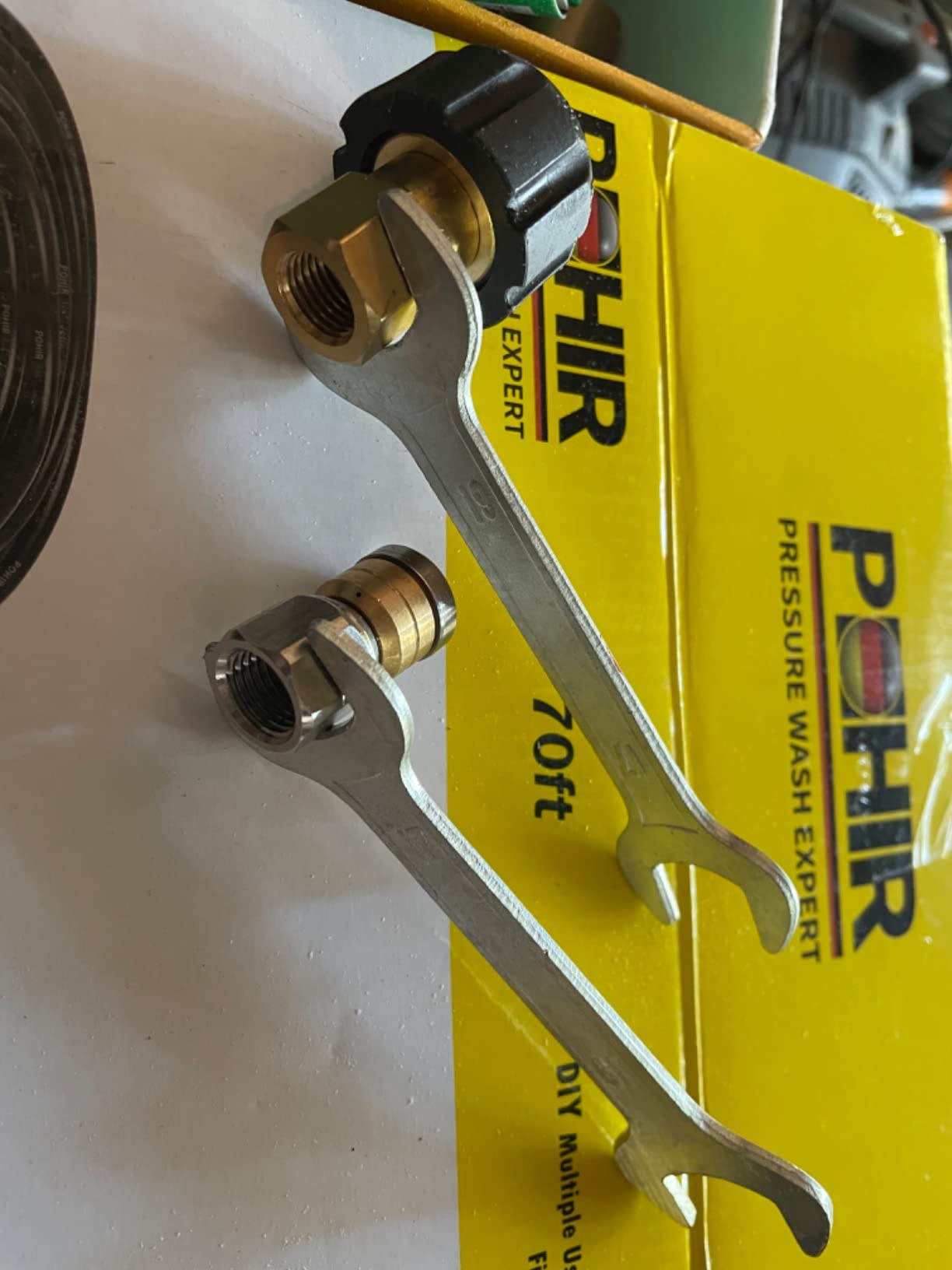 Unlike most the provided wrenches fit just fine (see photo). I managed the hose early by carefully uncoiling in the yard. Took the business end onto the roof and pushed into the vent for plugged drain. Then staged my gas pressure washer on the ground below and took up its wand up and plugged into it just like a nozzle. Worked the hose up and down a bit before the drain cleared. Worked perfect. Carefully recoiled the hose in about 2-ft loops and put away.LaterJ