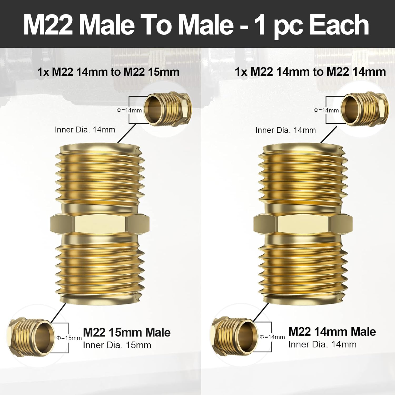 - M22 Male to Male : 1x M22 15mm male to 14mm male and 1x M22 14mm male to 14mm male adapter, convert the metric M22 14mm male thread to the M22 14mm or 15mm swirl as needed.