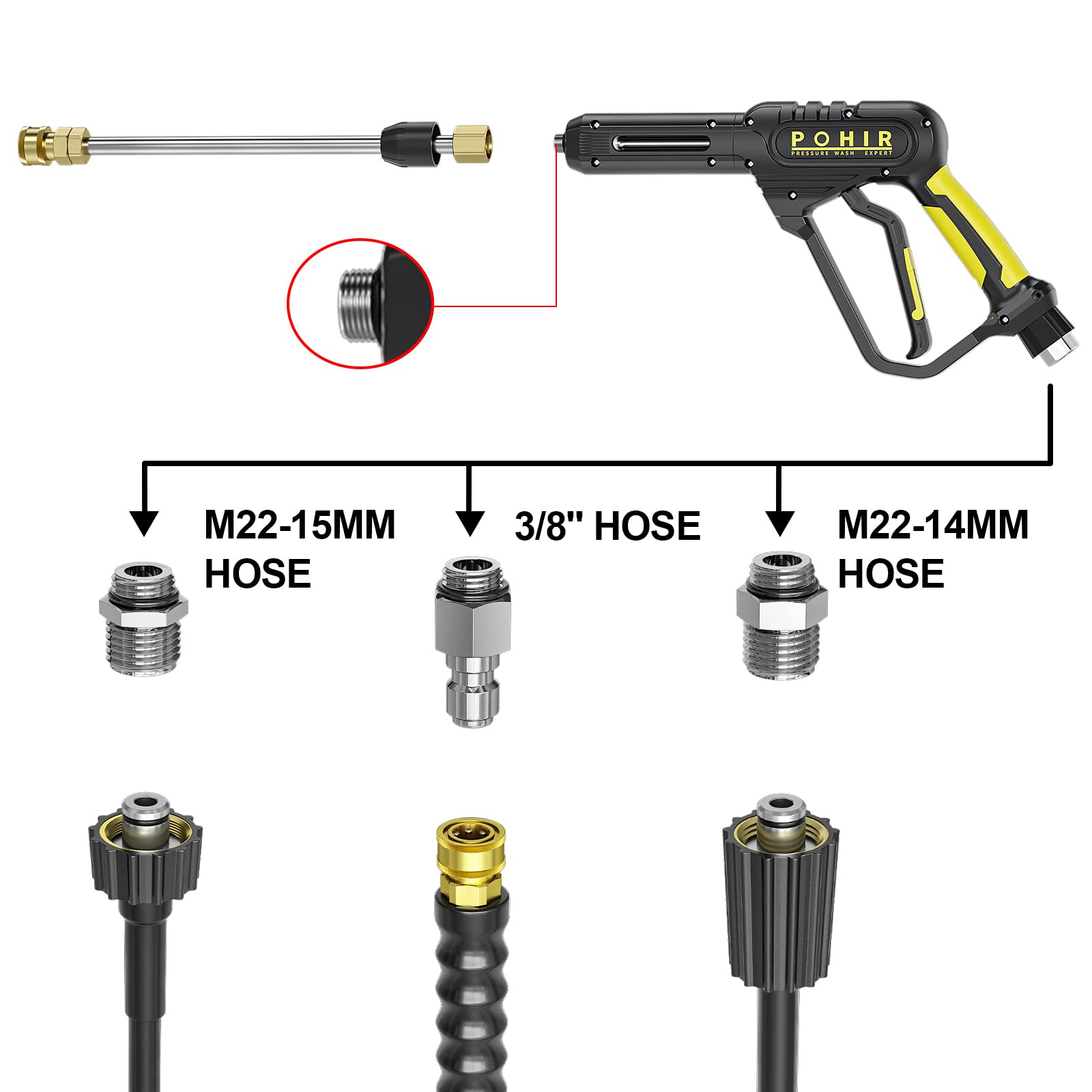 POHIR High Pressure Washer Gun 3600 PSI with 3/8'' Swivel Quick Connect, Extension Wand, M22 15mm and M22 14mm Fitting, 7 Nozzle Tips